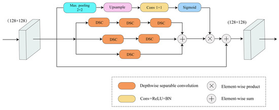 As shown in Figure 4, the model utilizes multiple depthwise separable convolutions [32] as the primary feature extractor. A residual attention mechanism is utilized to effectively reduce information loss and improve convergence speed during the stacking process. The model adopts a pyramid structure internally, where the input image passes through multiple depthwise separable convolution layers. The extracted features are then summed up, weighted with the soft mask branch of multi-scale features, and added to the original features to obtain the final output.