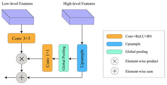 The global attention model is depicted in Figure 6. Firstly, the low-level features extracted by the decoder undergo a 3 × 3 convolution operation to reduce the number of feature maps and obtain a more compact feature representation. The high-level features from the encoder are upsampled and then subjected to global average pooling to capture the global contextual semantic information of the image. Subsequently, 1 × 1 convolution, batch normalization, and non-linear transformation operations are performed to further refine the high-level features for better guidance in the weighted fusion with the low-level features. Finally, the upsampled high-level features are fused with the weighted low-level features, and successive upsampling operations are performed to restore the image’s resolution. The global attention upsampling model fully utilizes global contextual information and features of different scales, and combines them with the low-level information output by the decoder through weighted fusion, thereby improving the performance and efficiency of the decoder.