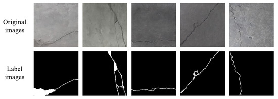In order to further test the segmentation effect of the algorithm, a new concrete cracks in underground integrated pipeline corridors dataset (CCUIPC) was introduced. All images were collected from underground integrated pipelines in some cities in Tianjin, China, totaling 2000 images. We used Labelme 3.11.2 to label the 2000 crack images. The image size was adjusted to 512 × 512. Figure 8 shows the original and labeled images of cracks in some urban underground pipe corridors, where the white area is the labeled cracks. As shown in Table 2, according to the requirements of model training, the crack image dataset was divided in the ratio of 8:1:1, in which the training set contained 1600 crack images, and the validation set and the test set contained 200 crack images respectively.