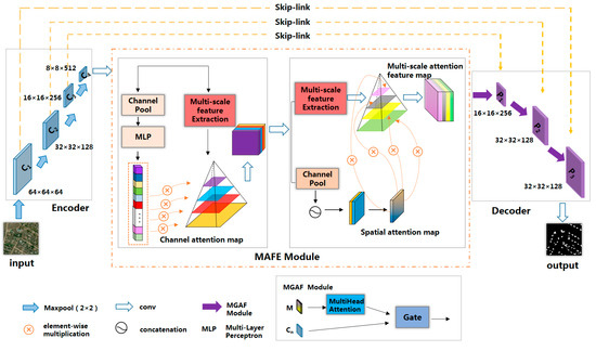 In the encoder section, the ResNet50 backbone network [32] was employed to proficiently extract the semantic characteristics of building structures. Within the MAFE module, we employed multi-scale channel attention and multi-scale spatial attention mechanisms, enabling adaptive concentration on pivotal channels and spatial regions within the image. This approach facilitated the precise and efficient extraction of multi-scale and multi-level information pertaining to building features. Transitioning to the decoding phase, we integrated the MGAF module, which conducts adaptive hierarchical weighted processing on multi-scale building attributes, thereby yielding a more comprehensive and enriched representation of building characteristics. Furthermore, through the astute utilization of the gating mechanism [33], we proficiently merged the low-level feature maps’ spatial details with the high-level feature maps’ semantic information. This approach enabled the in-depth exploration of multi-level and multi-scale attributes, culminating in the production of high-precision building feature maps. To address the challenge of vanishing gradients that often arises with deep neural networks, we thoughtfully incorporated skip connections between the encoder and the decoder. This design choice further safeguards the model training process’s stability. The overall network framework is shown in Figure 1.