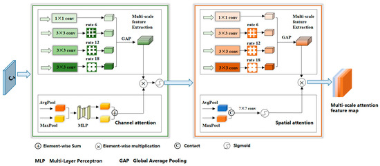 Compared with various remote sensing targets, buildings exhibit notable distinctions in terms of their significant scale variations, diverse geometries, intricate structures, and abundant internal intricacies [34]. Nonetheless, they frequently encounter challenges stemming from occlusion by surrounding objects or neighboring entities possessing similar textures and structures. This scenario imposes formidable obstacles in the realm of feature extraction. To tackle these challenges, we devised a novel component termed the Multi-scale Attention Feature Extraction Module, as shown in Figure 2. This module seamlessly integrates pyramid pooling, an attention mechanism, and dilated convolution, enabling the effective handling of issues such as variations in building size, shifts in perspective, and alterations in scale within remote sensing imagery. This, in turn, facilitates the more precise acquisition of multi-scale building features. Given the specific attributes of buildings, which are characterized by a limited semantic content but a profusion of intricate details, we opted to employ ResNet50 as the feature extractor for buildings. In order to retain an increased amount of detailed feature information, we selectively retained only the initial four levels of the Backbone module {C1, C2, C3, C4}, and additionally employed a convolution operation with a dilation rate of 2 at the terminal layer of each module to enhance the network’s receptive field.