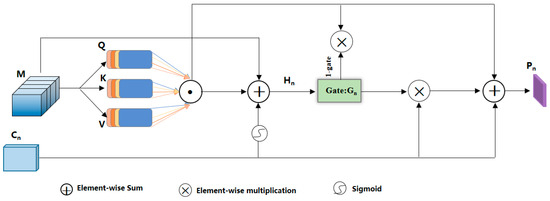 In the process of image restoration at the decoding stage, to create a high-level feature map encompassing shallow spatial details while embedding semantic information from high-level features into the middle and low-level feature maps, a conventional approach is to incorporate the pixel-wise downsampled result from the previous level into the corresponding low-level features from the encoding stage for feature fusion. However, this method treats both information components equally and disregards the distinct characteristics of features across different levels. Consequently, this often leads to a fusion result contaminated by significant noise. Therefore, within the MGAF module, we introduced a gating mechanism that took inputs from the feature maps at the same level of the encoder, the multi-scale feature map from the previous level, and the feature map processed by the multi-head attention mechanism. This approach enabled the generation of high-precision building feature maps. The mathematical formula governing this fusion process is presented below in Equations (8)–(10).