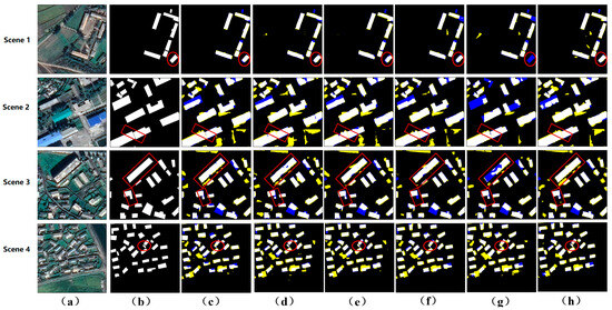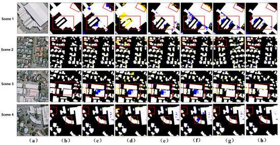 Visualization of the WHU aerial imagery dataset. (a) The input image. (b) The ground truth. (c) The results of Unet. (d) The results of SegNet. (e) The results of ViT-V. (f) The results of PSPNet. (g) The results of DeepLabV3. (h) The results of our model. The yellow and blue classification maps represent FP and FN, respectively.