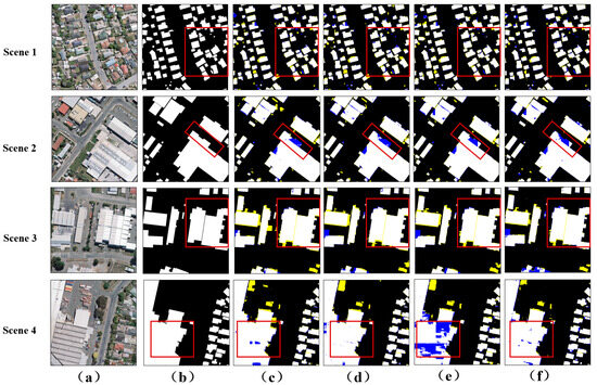 Visualization of the WHU aerial imagery dataset. (a) The input image. (b) The ground truth. (c) The results of RAPNet. (d) The results of GAMNet. (e) The results of GSMC. (f) The results of our model. The yellow and blue classification maps represent FP and FN, respectively.