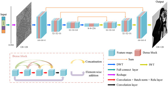 The applied network architecture for image reconstruction is illustrated in Figure 2. The input 1D signal is augmented by the fully connected layer to a 16,384 1D signal and reshaped into a 2D image. We continue to use the MWRDCNN proposed in our previous work [43] as the network architecture for image recovery, which has been proven to have superior image reconstruction performance. Compared with the traditional U-net structure, the MWRDCNN replaces the original pooling layer using wavelet and inverse wavelet transforms to complete the upsampling and downsampling processes, respectively, thus avoiding information loss. In each layer of the network, we introduce the dense block that enhances the learning capability of the network by establishing short-term connections among the feature maps. Furthermore, the dense blocks in different layers help the network to accurately extract image features at different scales. After the feature map undergoes the last layer of inverse wavelet transform, the network outputs a reconstructed image, and its weights are optimized based on the calculation of the residuals between the predicted ciphertext and the original ciphertext.