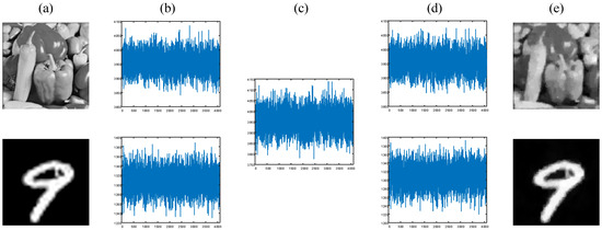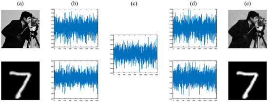To verify the feasibility of the proposed approach, some numerical simulations are performed, as shown in Figure 3a. The two images to be encrypted are the “cameraman” image from the “Set12” data set and the handwritten digital image from the MNIST data set. We first resize each image to pixels and set the number of modulation patterns to 1638, corresponding to a sampling rate of 10%. The single-pixel intensities simulated from these two images are given in Figure 3b. In Figure 3c, we show the 1D encrypted sequence output by the attention module. With the help of the sequence of cryptographic keys and the physics-driven neural network, two decrypted sequences and two high-quality plaintext images can be acquired, as shown in Figure 3d and Figure 3e, respectively.