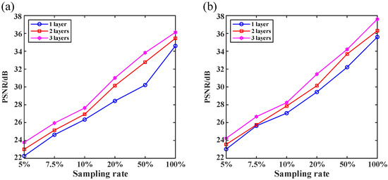 The reconstruction quality using the MWRDCNN with the number of layers changing from one to three at different sampling ratios is presented in Figure 4. We use the peak signal-to-noise ratio (PSNR) as a quantitative measure to evaluate the reconstruction quality: