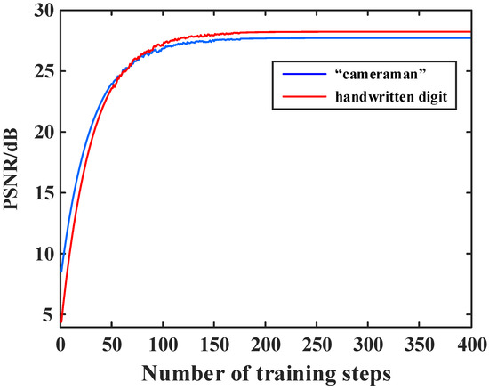 PSNR curves of reconstructed “cameraman” and handwritten digit images as a function of the number of training steps, which is changing from 1 to 400.