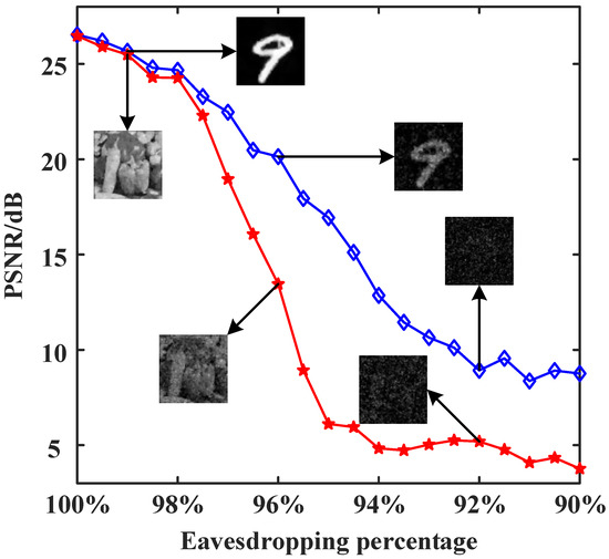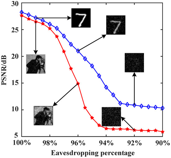 To verify the security of the attention-inserted cryptosystem, we perform an eavesdropping analysis. At first, the security of the system is ensured by the privacy of the modulation patterns and cryptographic keys. If the eavesdropper Eve randomly guesses a set of random modulation patterns and cryptographic key sequence, it is absolutely impossible for Eve to decrypt any information. From the perspective of matrix theory, even if the modulation patterns are wrong by just a little bit, the final decryption results will be very different. Now, let us consider an extreme case where Eve has bribed a user to acquire the complete modulation patterns, along with knowledge of the pixel size of the object images, and the cryptographic key with some missing values. Eve does not know whether the intercepted cryptographic keys are complete, and the length of the original cryptographic key sequence is only related to the number of modulations. In the following analysis, we examine the effect of the proportion of correct stolen cryptographic keys to the total number of cryptographic keys on the decryption and reconstruction quality. In Figure 6, we plot the PSNR curves of the “cameraman” and handwritten digit images as a function of the eavesdropping percentage. For the grayscale “cameraman” image, when the eavesdropping ratio is lower than 96%, the reconstructed image does not contain any valuable information. For the handwritten digit image, the reconstruction quality gradually decreases as the eavesdropping ratio decreases, and when the eavesdropping ratio is lower than 92%, no valuable information can be displayed in the recovered image. Thus, very few missing keys can lead to deciphering failures. Furthermore, as long as the length of the cryptographic key sequence is large enough, the proposed cryptosystem will exhibit good resistance to eavesdropping attacks.