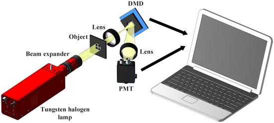 We built the SPI’s experimental setup to further verify the proposed method, as shown in Figure 7. The thermal light emitted from a tungsten halogen lamp is collimated and then illuminates the object to be encrypted. The light field that carries the object information is imaged onto a digital micromirror device (DMD) for intensity modulation. The modulated light field is then focused by a lens and collected by a photomultiplier tube (PMT), which outputs a 1D sequence of single-pixel values. In this scheme, the two object images required for a single encryption are encoded in this way.