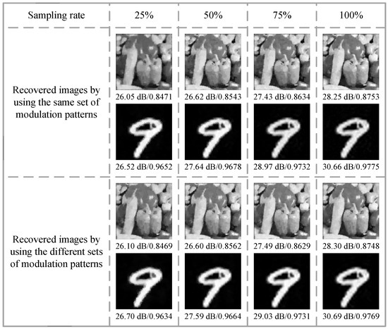 In the first case, two object images are encoded using two identical sets of modulation patterns, whereas in the second case, they are encoded using two different sets of modulation patterns. It can be seen that in both cases, the grayscale “peppers” image can be reconstructed with high quality at a sampling rate of 25%. The details of the reconstructed images become more enriched with the increase in the sampling rate. The handwritten digit “9” image exhibits excellent recovery when the sampling rate is not less than 25%. Benefiting from the use of the attention module and physics-driven neural network, our encryption method can complete encryption using arbitrary modulation patterns and achieve good decryption results, which are sufficient to meet practical requirements.