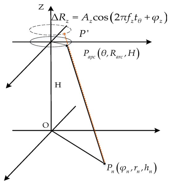 Simple harmonic vibration in all directions ultimately manifests itself in the form of signals affecting the instantaneous slant distance between the antenna platform and the measured target point, and all are in the form of ideal slant distance plus the amount of change in slant distance. In the absence of vibration compensation, it can be assumed that every direction of vibration results in a large change in the instantaneous slant distance, and the impact of vibration in that direction on the imaging quality will be great. Figure 3 presents a simplified vibration model of the ideal scene, where there is a simple harmonic motion in the Z-axis ; at this time, the actual equivalent sampling point P′ and the point target of the instantaneous slant distance is