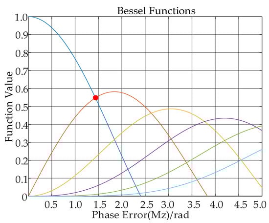 From Figure 4, the different lines stand for the 0th to 6th order Bessel functions. The red dot stands for , it can be seen that as varies, the overall oscillation of trends toward 0, and when , as the order increases, decreases gradually. Therefore, the amplitude of vibration not only affects the peak value of the main image, but also affects the number of echoes. The larger the amplitude, the more pairs of echoes are generated.
