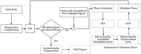 Due to the periodic time-varying nature of airborne platform vibration, it is often difficult to accurately compensate for the vibration error via analytical equations when the vibration parameters are unknown. This is due to the complex nonlinear Doppler phase modulation of the SAR echo by the vibrating target, which results in a broadening of the echo spectrum, the so-called micro-Doppler effect []. The micro-Doppler effect destroys the characteristics of the echo signal on which conventional SAR imaging algorithms rely. In addition, the high-frequency vibration of the platform generates a large number of paired echoes in the azimuthal direction, which leads to attenuation of the main image’s intensity and image scattering [].
