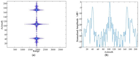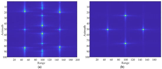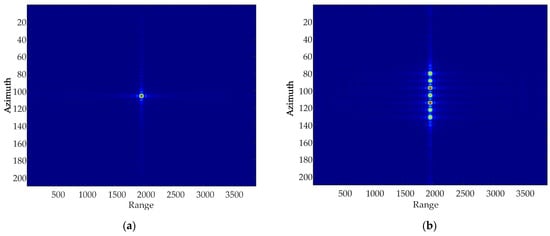 Due to the influence of paired echoes, the point target is copied many times in the azimuth direction, resulting in the real target not being able to be identified. As shown in Figure 7 the colorful points stand for the point target. In Figure 7a, imaging result without adding the vibrational phase only shows the real target, while Figure 7b presents the pair of false targets in addition to the real target after adding the vibrational phase. This result shows that the sinusoidal modulation phase introduced by the vibrational phase error produces false targets in the azimuthal direction, also known as “ghost images”.