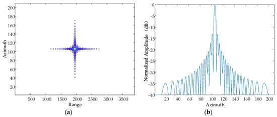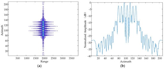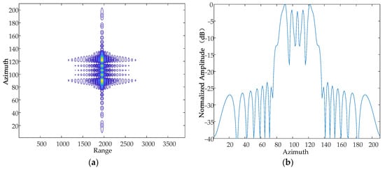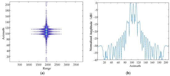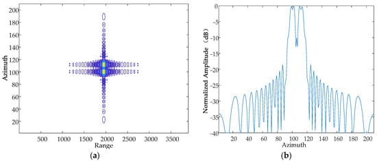 Contour map and azimuthal slices of 5 mm. (a) Contour plot, whose horizontal coordinates represent the number of distance-directed sampling points and whose vertical coordinates represent the number of array-directed sampling points, and the contour plot reflects the focusing performance of the point target. (b) Array-direction response function, with the horizontal coordinates representing the number of array-direction sampling points and the vertical coordinates representing the normalized amplitude, and the array-direction slices reflect the number of pairs of echoes generated by the vibration.