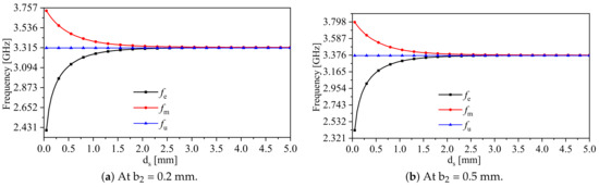 where , the calculated resonance frequency of the dominant mode () is 7.81 GHz. Thus, the intended system’s resonance frequency must be lower than 7.81 GHz for an accurate prediction of the resonance frequencies, and , and . For all calculations in this section, the dimensions of the system without TL are exactly the same as those presented in Table 1, except for = 15 mm and = 20 mm.
