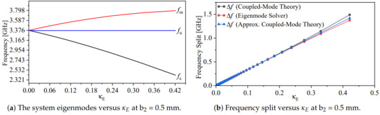 For the synchronous resonator case (), the coupling parameter can be related to the electric coupling coefficient by substituting Equation (7) into Equation (6). Hence, the frequency split, , can be written as