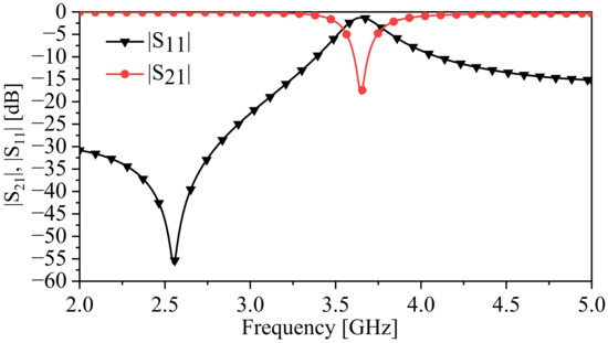The response of the one-SRR-based system in the form of the transmission and reflection coefficients ( and ) at = 0.5 mm.