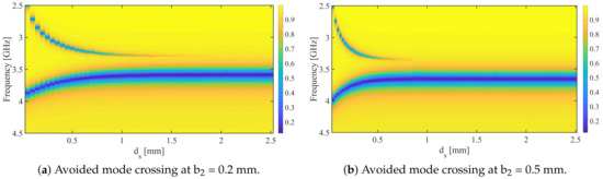 Next, the two-synchronous-SRR-based system will be simulated, with the design specifications shown in Table 1, where is chosen to be 0.5 mm. The space between the resonators () is variable, ranging from 0.05 to 5 mm with a step value of 0.05 mm. Figure 8 illustrates the response of the system at two values of , 0.05 and 0.45 mm. For = 0.05 mm, the resonance frequencies, and , at min, are 2.513 and 3.973 GHz, respectively, whereas in the case of = 0.45 mm, and are 3.2 and 3.754 GHz, respectively. It is evident that the split between and is inversely proportional to . Furthermore, avoided mode crossing can be investigated by plotting the transmission coefficient () in a 2D plane as a function of frequency and , as illustrated in Figure 9, for two chosen values of (0.2 and 0.5 mm). As predicted by the eigenmode-solver-based analysis, avoided mode crossing can be observed, and it is strong at smaller values of , as a result of strong electric coupling between the resonators. This coupling can be disturbed, for example, by dielectric materials placed between the resonators if one wants to utilize the system as a sensor.