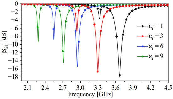 The predominant coupling in the proposed system is the electric coupling, which can be disturbed or controlled by MUTs. Thus, the system can be utilized as a microwave sensor, as illustrated in Figure 10. To emphasize the effects of an MUT on mode splitting, we set the spacing between the resonators at the onset of mode splitting, which corresponds to a spacing (ds) of 1 mm. This choice is based on the numerical results shown in Figure 9. In addition, the spacing is chosen based on an MUT, with dielectric constants of 2.33 and 9.2, which will be utilized to demonstrate the effects of the proposed sensors. Note that the spacing between the resonators can be optimized based on the range of the intended dielectric constants to be tested. For instance, for high-dielectric materials, a larger separation would be better suited. A dielectric slab with a width ( = 3.2 mm), length ( = 13 mm), and thickness ( = 3 mm) is placed between the resonators, as shown in Figure 10. We first performed the numerical simulation by sweeping the dielectric slab’s constant from 1 to 11 with a step value of 0.5. Since the system’s response will overlap at different values of the dielectric constant, only certain values were selected to plot the response, as shown in Figure 11.
