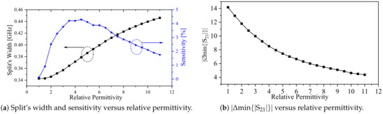 where S, , and are the sensitivity, the amount of frequency split, and the initial frequency split in air (i.e., ), respectively. The sensitivity curve is shown in Figure 12a in blue. Initially, the sensitivity is low but rapidly increases to 4.3% at a relative permittivity of 4.5. Afterwards, the sensitivity decreases, reaching 1.5% at a relative permittivity of 11. It is interesting to note that the location of maximum sensitivity is dependent on the spacing between the coupled resonators, which may be optimized for a specific targeted permittivity range.
