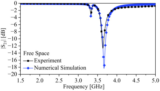 Figure 14 shows the response of the system in the presence of free space for both experimental and numerical results. The measured and were 3.3275 and 3.64 GHz, respectively, and using Equation (6), the calculated was 0.0887, with a calculated split width of 0.3125 GHz. Comparing the split widths of the experimental and numerical results (0.338 GHz), the calculated error is 7.5 %.