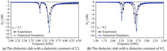 Furthermore, the system was also used to detect the presence of two slabs with dielectric constants of 9.2 and 2.33. Figure 15a,b show the experimental response of the system detecting the two slabs compared with the numerical simulation. The extracted and from the response of the system detecting the slab with a dielectric constant of 2.33 were 3.055 and 3.3875 GHz, respectively, with a calculated of 0.1036. Comparing the split width of the experimental (0.3325 GHz) and numerical results (0.344 GHz), the calculated error is 3.343 %. In the case of 9.2, and were 2.3025 and 2.6575 GHz, respectively, with a calculated of 0.1424. Again, comparing the split widths of the experimental (0.355 GHz) and numerical results (0.431 GHz), the calculated error is 7.6%. Therefore, the results show that the loaded MUT can increase the electric coupling between the resonators, and indeed, the proposed system shows a true microwave differential sensor for dielectric materials. Table 2 summarizes the main results with calculated errors in the frequency splits between the numerical and experimental results.
