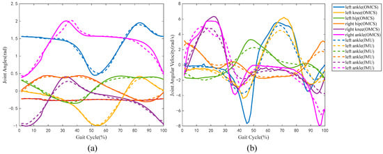 A typical group of kinematic parameters, where (a) represented the joint angles and (b) represented the joint angular velocities. The signals acquired by the self-developed sensor system are represented by the dotted lines, and those acquired by the optical motion capture system (OMCS) are represented by the solid lines.
