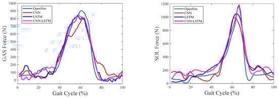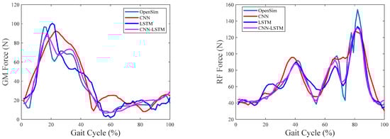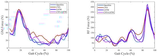 Table 3 shows the correlation coefficients and RMSE% for estimating muscle forces using CNN, LSTM, and CNN–LSTM. It can be seen that CNN–LSTM performed the best with an average correlation coefficient and RMSE% of 0.9807 and 15.14% between the estimated and referenced values.