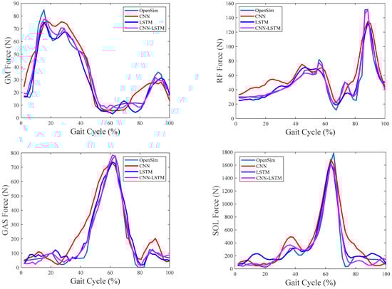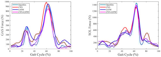Furthermore, in order to verify the comprehensive performance of CNN–LSTM in estimating muscle forces, all the obtained data were fused into a whole dataset, which included the data of 1200 gait cycles (10 gait cycles at each walking speed for each subject performed by 40 subjects at 3 different speeds). We took the data of 960 gait cycles for neural network training, and the remaining data were used for subsequent validation.