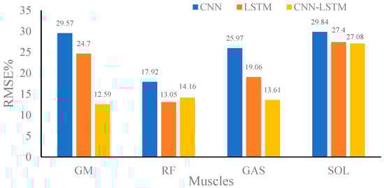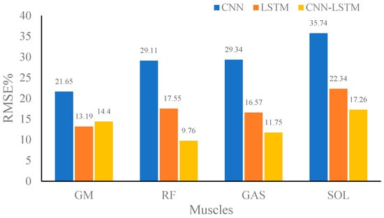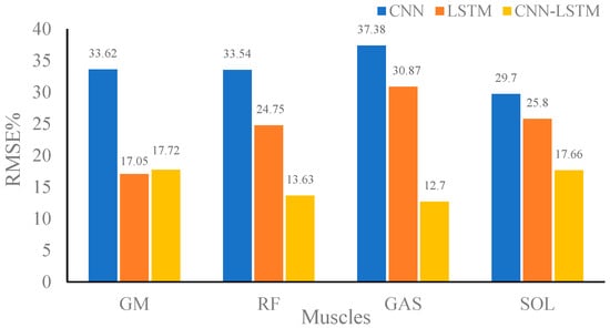 Root mean square percent (RMSE%) of the predicted muscle strength at medium speed using convolutional neural network (CNN), long-short-term memory (LSTM), and CNN–LSTM.