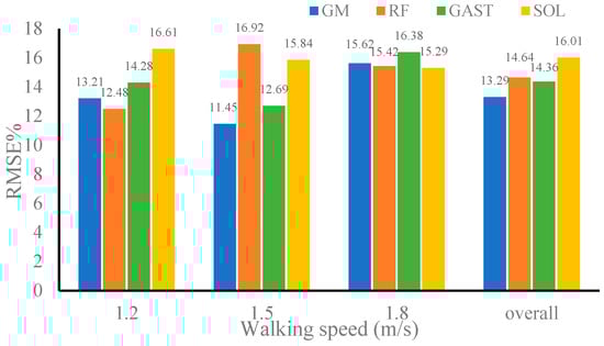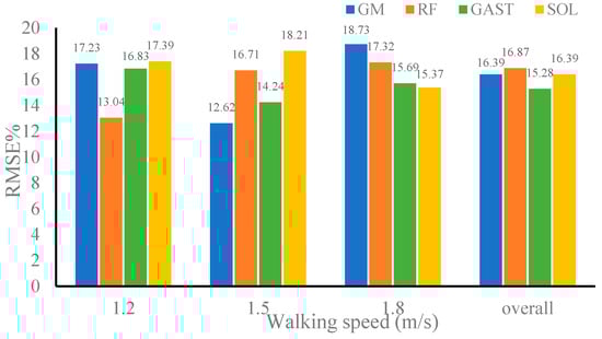 Table 4 shows the correlation coefficients between the estimated and referenced values of the muscle forces of the GM, RF, GAST, and SOL using CNN–LSTM for validation datasets 1 and 2. Figure 10 and Figure 11 represent the RMSE% of muscle forces estimated by CNN–LSTM using validation dataset 1 and validation dataset 2, respectively. It can be seen that when the gait data of the three walking speeds in validation dataset 1 were used as inputs to CNN–LSTM, the correlation coefficients between the estimated and referenced muscle forces of the four muscles were not less than 0.9720, and the RMSE% was not greater than 16.92%. Meanwhile, the gait data of the three walking speeds in validation dataset 1 were randomly combined as inputs to CNN–LSTM, and the correlation coefficients of the four muscles were 0.9793, 0.9846, 0.9719, and 0.9802, with an average correlation coefficient of 0.9790. The RMSE% of the four muscles was 13.29%, 14.64%, 14.36%, and 16.01%, respectively, with the average RMSE% being 14.58%. The performance of CNN–LSTM in estimating muscle forces using validation dataset 1 showed only a slight decrease compared to that using the training dataset, but it did not affect the usability of the model. The above results indicated that the performance of the CNN–LSTM model proposed in this paper in muscle forces estimation was minimally affected by individual differences and had strong universality.
