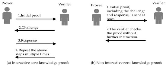 Non-interactive zero-knowledge proofs, on the other hand, involve a one-way transmission of proof from the prover to the verifier without further interaction. The advantage of this method is that the prover can pre-generate a proof and reuse it across multiple scenarios, eliminating the need for ongoing interaction with the verifier. To achieve non-interactivity, techniques such as a “common reference string” or cryptographic tricks like the Fiat–Shamir heuristic are often employed to convert interactive protocols into a non-interactive format. Zero-knowledge succinct non-interactive arguments of knowledge (zk-SNARKs) are a widely-used form of zero-knowledge proofs, particularly applied within blockchain technology and extensively used on platforms like Ethereum [40]. A comparison between interactive and non-interactive zero-knowledge proofs is illustrated in Figure 1.