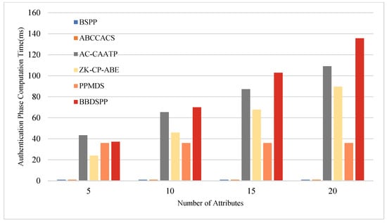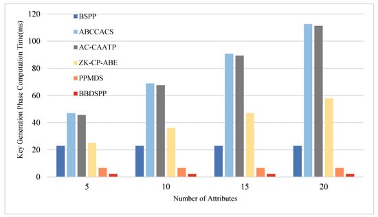 To further substantiate the theoretical analysis of each scheme, we conducted simulation tests using a laptop equipped with an i7 7500 u 3.0 GHz processor, 16 GB RAM, and 256 GB storage (Intel, Santa Clara, CA, USA), within a Python 3.12 software environment. To ensure the same level of security strength, the order of the bilinear group is chosen as a 512-bit large prime number, and the order of the bilinear group is selected as a 256-bit large prime number. Multiple operations are conducted, and the average values are taken as the final results. The average time for one hash function operation is approximately 0.00052 ms. The average time for one bilinear pairing operation is about 5.4005 ms, and the average time for one exponentiation or modular exponentiation operation is 2.1875 ms. Four different sets of attribute numbers possessed by end members are set, namely 5, 10, 15, and 20, to compare the time consumption in the four phases of key generation, authentication, encryption, and decryption. The specific time consumption comparison charts are shown in Figure 5, Figure 6, Figure 7 and Figure 8 and the specific values are detailed in Table 10, Table 11, Table 12 and Table 13.