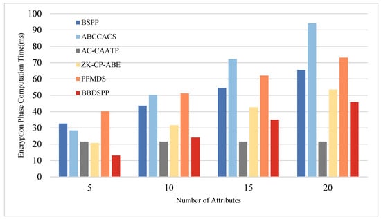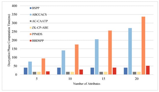 During the encryption phase, the computational load of the scheme presented in this paper is the lowest when the number of attributes is less than 10. However, when the number of attributes exceeds 10, the computational load of our scheme is only higher than that of AC-CAATP. This indicates that the scheme proposed in this paper is more efficient when dealing with a smaller number of attributes.