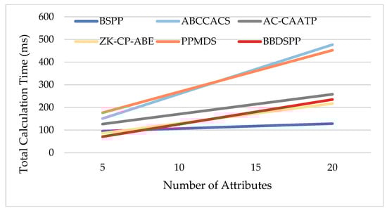 From the above charts, it is evident that the total computational load of the BBDSPP scheme is consistently lower than that of ABCCACS, AC-CAATP, and PPMDS. It is slightly higher than ZK-CP-ABE when the attribute value exceeds 10. This is because our scheme employs a non-interactive zero-knowledge proof protocol to generate zero-knowledge proofs of private keys for terminal members and characterizes attribute values to realize flexible combination of permissions. This enables terminal members to access system data flexibly and securely. ZK-CP-ABE does not implement this feature. Since the BSPP lacks an identity authentication function, its total computation time is always lower than that of the BBDSPP scheme. In summary, by comparing the computational consumption of various schemes through simulation experiments, it is evident that the scheme proposed in this paper not only addresses the deficiencies of existing schemes but also demonstrates comparable or superior performance in terms of computational consumption, further validating the feasibility of our scheme.