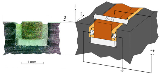 The sensor principle used in this work is based on the structural integration of piezoceramic elements with a rectangular cross-section into a workpiece by forming [24,25]. First, a cavity in the workpiece, in this case a sonotrode, is formed by milling. A punch is then used to form another piece of metal and thereby clamp the piezoceramic elements in the structure. A direct electromechanical coupling can therefore be achieved without the use of adhesives. In previous studies, these sensors have been integrated into materials like aluminum alloy EN AW-5083 [26,27] and steel sheets of X5CrNi18-10 [23]. In this paper, an approach to integrate them into a sonotrode made of Ti6Al4V is presented.