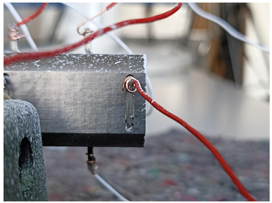 For the ultrasonic system, a new transducer and sonotrode are designed for the integration of the piezoelectric fibers. The general design has been thoroughly explained in the literature [29,30,31]. The transducer consists of two piezoelectric discs made from SONOX P8 (Ceramtec) sandwiched between three electrodes made from copper. The back and front masses are made of AW 6060. An M8 bolt is used to preload the stack. Inside the piezoelectric stack is a cylindrical sleeve made from PTFE to insulate the bolt from the electrodes and piezoelectric discs. The sonotrode is made from Ti6Al4V. On the transducer side, the diameter of the sonotrode is 38 mm; on the other side, the shape has a round cross-section with milled-in flat surfaces to place the sensors in different positions. For the application of the piezoelectric fibers, a flat surface is beneficial for the assembly process. The sonotrode still has a symmetrical cross-section to prevent bending during vibration. Because of the reduction in the area of the cross-section, an amplification of the vibration amplitude will occur. The amplification factor is approx. 2.15. A flange near the middle of the sonotrode is used for mounting the ultrasonic system. Eight of the cavities described in Section 2.1 are placed on the milled surfaces. Two cavities are placed on each side of the sonotrode. On the front and back side of the sonotrode, the cavities are parallel to the flange of the sonotrode; on the other sides, the cavities are perpendicular to the flange. One cavity on each side is placed as close as possible to the flange, the other one at the tip of the sonotrode. A close-up of one of the sensors can be seen in Figure 3. The sensors and their designation are listed in Table 1. They are categorized by their position on the sonotrode (at the tip, as seen in Figure 3, or near the flange), their orientation (horizontal or vertical relative to the flange) and their position on the top or bottom side of the sonotrode.
