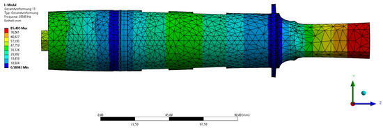 The design of the transducer as well as the sonotrode was accompanied by a simulation approach using modal analysis. For this, a coupled-field modal analysis was carried out in ANSYS Workbench 2022 R2. The material properties for all parts except the piezoelectric ceramics of the transducer and the sensors as well as the Ti6Al4V and AW 6060 were taken from the ANSYS library. The properties of the piezoceramics are shown in Table 2. The material properties of the Ti6Al4V and AW 6060 were provided by the supplier. A fixed support was added at the flange, as described above. A voltage was then applied to the piezoceramic discs of the transducer to actuate the system. With these settings, a modal analysis was carried out between 15 and 30 kHz to determine the resonance frequencies. This was performed to obtain the relevant vibration shapes of the system in this frequency range to better differentiate them later based on the sensor signals. The desired frequency of the system was chosen to be approx. 25 kHz. The length of transducer was iteratively adjusted to achieve this resonance frequency. Afterwards, the sonotrode was adjusted to match the resonance frequency of the transducer. The vibration shape of the ultrasonic system at the determined resonance frequency of 24,388 Hz is shown in Figure 4.