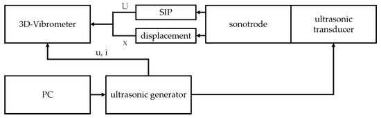 For the experiments regarding the piezoelectric sensors, an excitation frequency of 23,344 Hz is therefore chosen. The maximum displacement at this frequency is 2.8 m at the tip of the sonotrode and 1.5 m at the end of the transducer. The real amplification factor is, therefore, 1.87. That is approximately 87% of the calculated amplification factor.