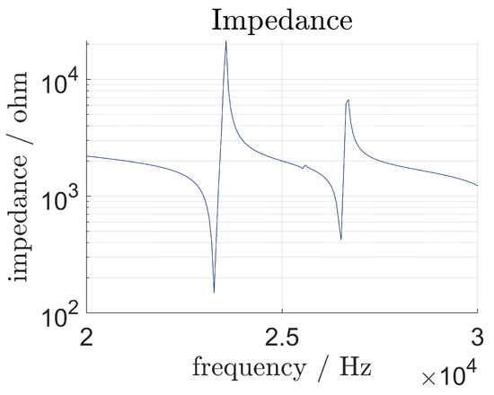 The results of the impedance analysis are shown in Figure 6. The resonance frequency of the longitudinal vibration mode is obtained at 23,261 Hz. This is slighty lower than the frequency determined in the numerical modal analysis. All relevant resonance frequencies are listed below.