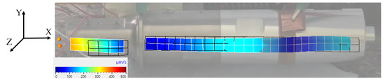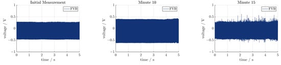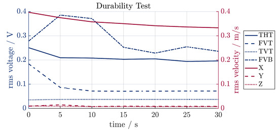Because of the high vibrations and strains in the sonotrode, the durability of the sensors needed to be evaluated. The ultrasonic system was powered continuously for 30 min and a short measurement was carried out every 5 min. The transducer was actuated at 23,410 Hz for this experiment, since a preliminary test showed that the resonance frequency shifted slightly. The results are shown in Figure 13. All values shown are rms values. For comparing the sensor signals with the real vibration of the system, the vibration velocity at the tip of the sonotrode is given. The main part of the vibration is in the x-direction, which confirms that the system is operating at or close to the resonance frequency of the system. Furthermore, it can be seen that the velocity drops during operation. It can be assumed that there is some heat build-up in the transducer and sonotrode, which affects the resonance frequency. Since no control loop was implemented, the ultrasonic system did not adjust for this during operation. At 30 min, the rms value of the velocity is approx. 80% of the initial value. Only some of the piezoelectric sensors follow this trend. THT and FVT show the same behavior, ending at 80% and 30% of their initial value, respectively. The value of TVT is constant and FVB shows erratic behavior. This is more clearly visualized in Figure 14. A clear signal can be seen for the initial measurement up until minute 10. Between minutes 10 and 15, the signal started to show more random noise and random peaks. This persisted for the subsequent measurements. A reason for this might be that the connection between the sensor and the sonotrode may have gotten loose. Afterwards, the connection of all sensors was tested and was confirmed to still be intact. It stands to reason that the piezoelectric fiber itself was damaged during operation.
