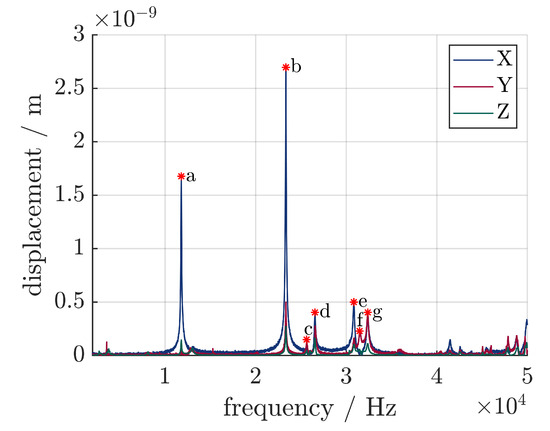 The vibration-shape analysis shows distinct resonance frequencies at the following frequencies, as seen in Figure 9. Distinctive vibration modes are marked with the letters a through g. a, b and e mark the first, second and third longitudinal modes, respectively, while c, d and f mark the bending modes. The second longitudinal vibration mode has the highest displacement, because it is mounted at the node. The node of the first longitudinal vibration mode is located at the contact surface between the transducer and the sonotrode. Since the sonotrode is mounted at half its length and not the node for this specific vibration mode, the vibration is damped and therefore, exhibits lower displacement. The electrical resonance frequency is 64 Hz lower than the mechanical resonance frequency, which might be explained with [10,15], where it is stated that mechanical and electrical resonance frequencies may differ because of nonlinear effects.