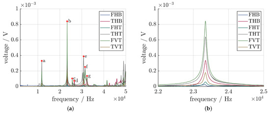 For the vibration-shape analysis, the signals of the piezoelectric sensors were measured as well. The results shown in Figure 10 present an identical behavior, which means that they can detect the resonance frequency of the ultrasonic system as well. The peak at 23,344 Hz can clearly be seen across all sensors, albeit with varying intensity. FVT shows the highest voltage, followed by THT and THB. A clear correlation between the sensor position and the generated voltage is not apparent.