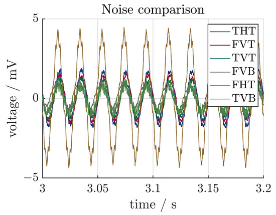Firstly, the noise of the sensors was investigated. For this, a short measurement was carried out where the system was not excited at all. A section of the measurement, adjusted for the offset, is shown in Figure 11. It can be seen that all sensors show noise with an amplitude lower than 5 mV. Furthermore, the noise is not just random noise, but has a frequency of 50 Hz. This indicates that the electrical shielding is not sufficient. Because of the much higher voltages, this noise does not affect the measurement and can easily be filtered out. If strains are lower, the noise might be more impactful.
