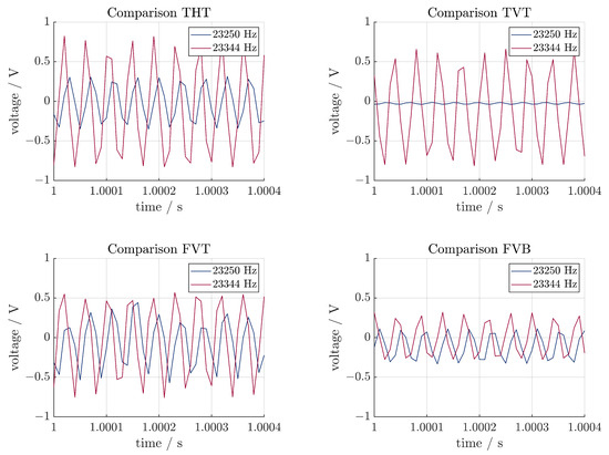 For the comparison of the sensors, the signals of four sensors are shown in Figure 12. In every figure, two measurements are shown. One is obtained from operating at the resonance frequency, the second one at 23,250 Hz. The measured voltage is lower than 1 V for all measurements. In this context, the determined noise is negligible compared to the signal voltage. For all sensors, the measured voltage at the resonance frequency is higher than at another frequency. This can be attributed to lower strains in the sonotrode and was to be expected. The difference between the two measurements varies between the sensors. This may be attributed to the different positions of them in relation to the sonotrode. FVT and FVB have the same position on the sonotrode (perpendicular and close to the flange) and are on opposite sides. Still, they exhibit different behavior. The voltage of FVB is lower. This may indicate either damaging of the piezoelectric fiber during manufacturing and, therefore, an effect on the electromechanical properties of the sensor or an uneven vibration in the system. TVT, in comparison, shows the same behavior as THT when operating the system at the resonance frequency. When not operating at the resonance frequency, the voltage is lower than at any other sensor. The signal can still be attributed to the vibration in the system. In theory, the highest strains in the sonotrode occur near the flange. Therefore, FVT (perpendicular near the flange) should experience higher strains than TVT (vertical near the tip) and therefore, generate a higher voltage. This is not the case, at least for operating at the resonance frequency. In conclusion, all sensors correctly measured the vibration of the sonotrode when operating at different frequencies, but there is no clear relation between the orientation or position of the sensor and the measured voltage.