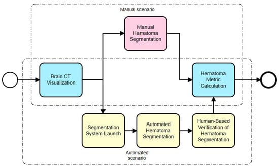 We considered two scenarios for hematoma segmentation: a manual scenario and an automated scenario. Manual hematoma segmentation consists of the following steps: