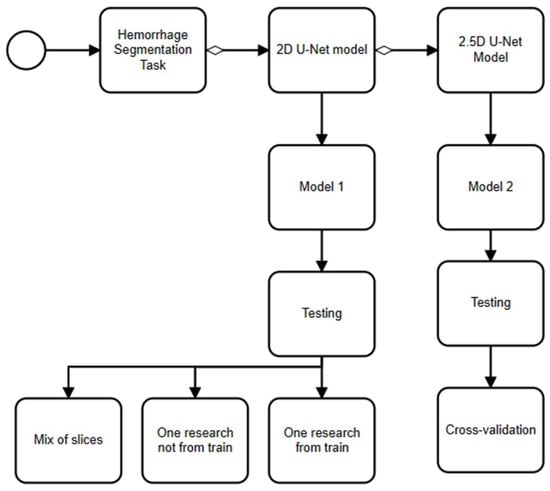 The articles reviewed lead to several key observations. Firstly, the subject matter is of high relevance and has been extensively studied. However, there is a scarcity of research, specifically on subdural hematomas, which can be attributed to the complexity of segmentation, with only a few works such as [,] addressing this area. In addition, U-Net architecture is predominantly used in these studies [,,,], while CycleGAN [], EfficientNet and DeepMedic [] are also employed. Some studies have also explored the approach to recognize hematomas [,]. Lastly, overlap metrics, namely, the Jaccard and Dice metrics, are commonly used for model evaluation.