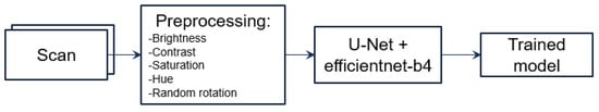 We proposed using a U-Net model, which is a convolutional neural network designed for biomedical image segmentation, to perform the segmentation task (see Figure 3). The input images were grayscale and had a resolution of 512 × 512 pixels. Then, we implemented augmentation of the CT images to extend our dataset (see Figure 4). Next, we implemented the training process interactively until the Dice metric was improving. Once the Dice metric improvement was completed, we stopped the training. We set the learning rate to 0.0001 (found empirically) and used the EfficientNet-B4 as the backbone of the U-Net model. We used softmax as the output activation function and relu as the layer activation function. We used DiceLoss as the loss function and applied and compared different threshold values (0.3, 0.5 and 0.7) to binarize the output masks (see Section 4).